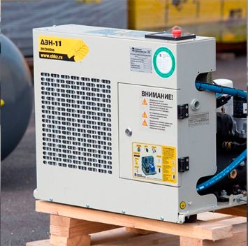 Установка компрессорная ДЭН-11Ш представляет собой законченный и готовый к эксплуатации блок, скомпонованный на общей раме, не требующей специального фундамента, снабженный звукоизолирующим кожухом и системой автоматизации.